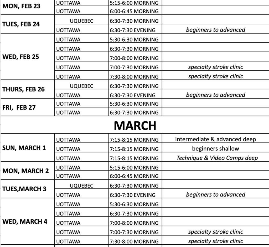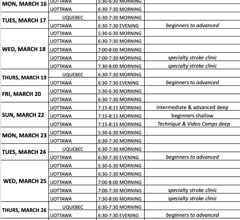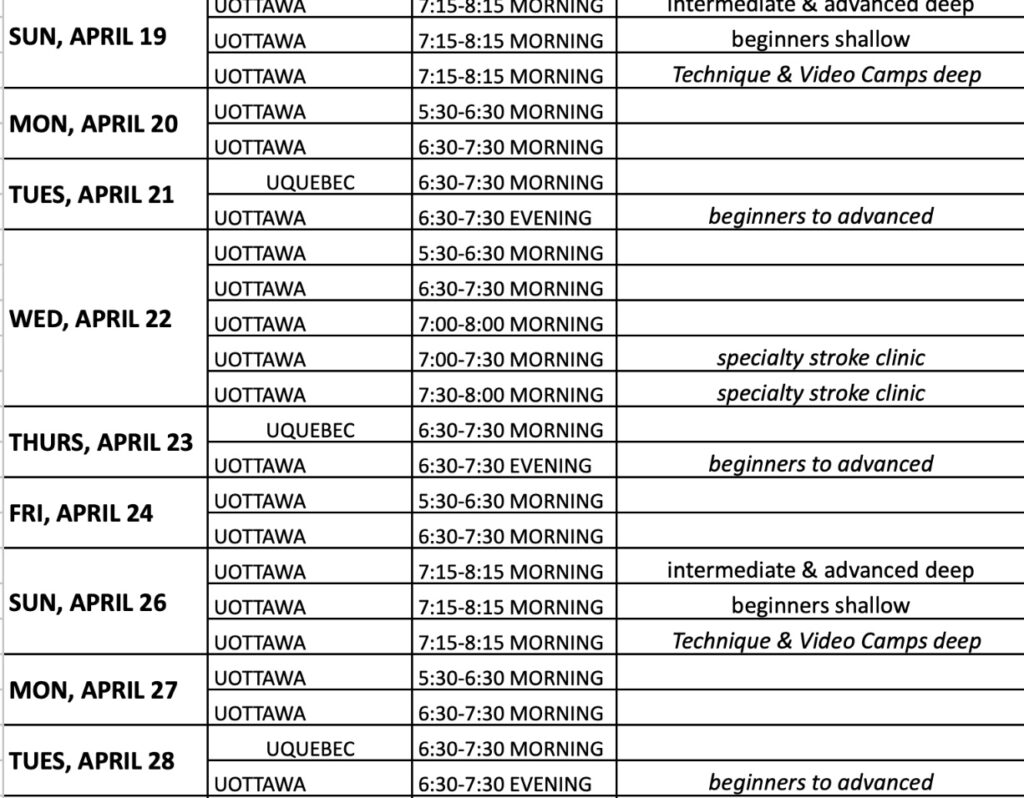 • 7:15–8:15AM MORNING uOttawa (shallow) Beginners