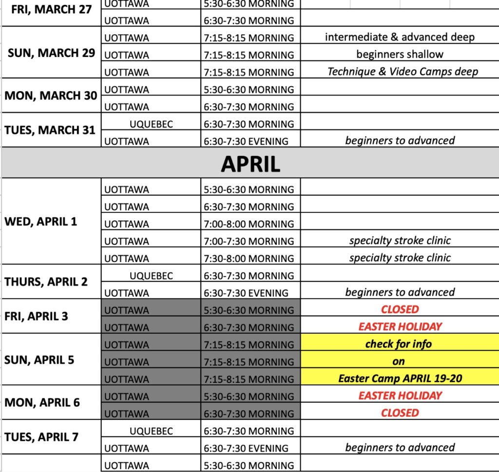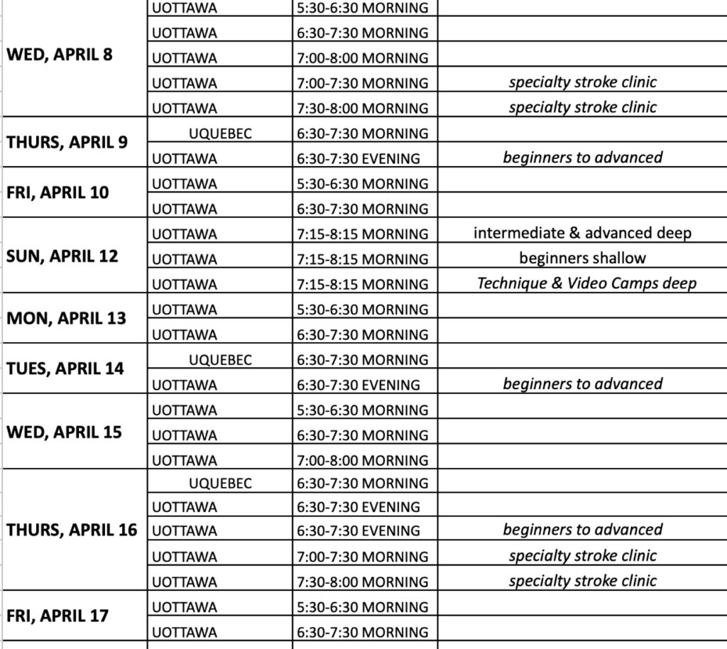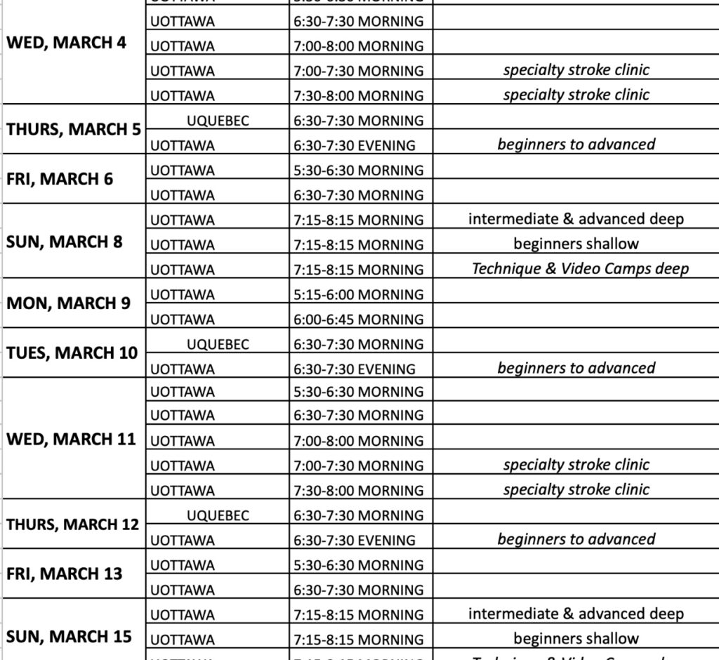 • 7:15–8:15AM MORNING uOttawa (shallow) Beginners